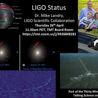 Announcing the next talk of the TMTS series (Thirty Minutes for Talking Science) Dr. Mike Landry, LIGO Handford Observatory and on behalf of the LIGO Scientific Collaboration LIGO Status Thursday 26th April, 11.30am (PDT), TMT Project Office Board Room Request for remote participation to Warren Skidmore (was@tmt.org)