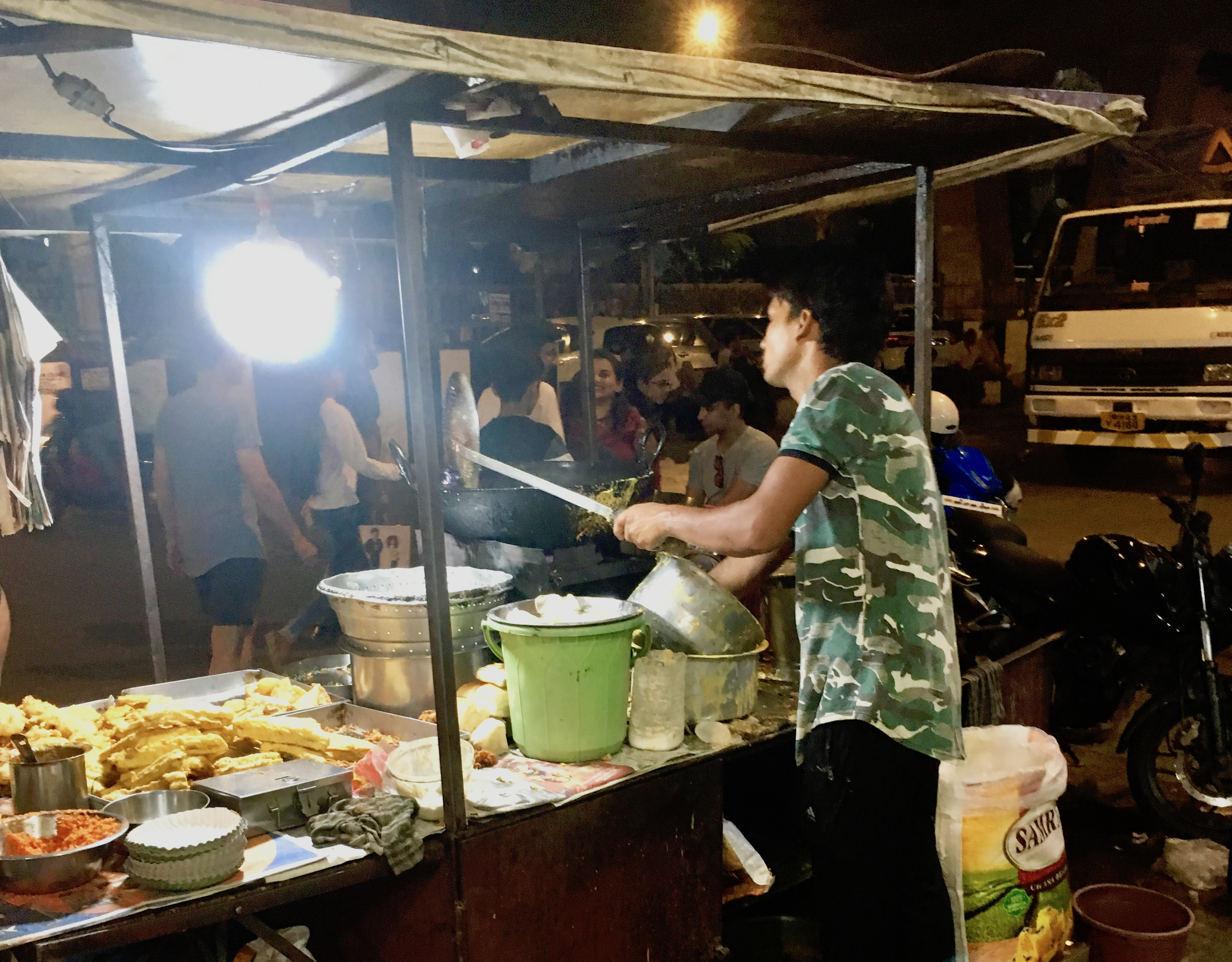 Here's a street food vendor, offering vegetarian snacks and meals.