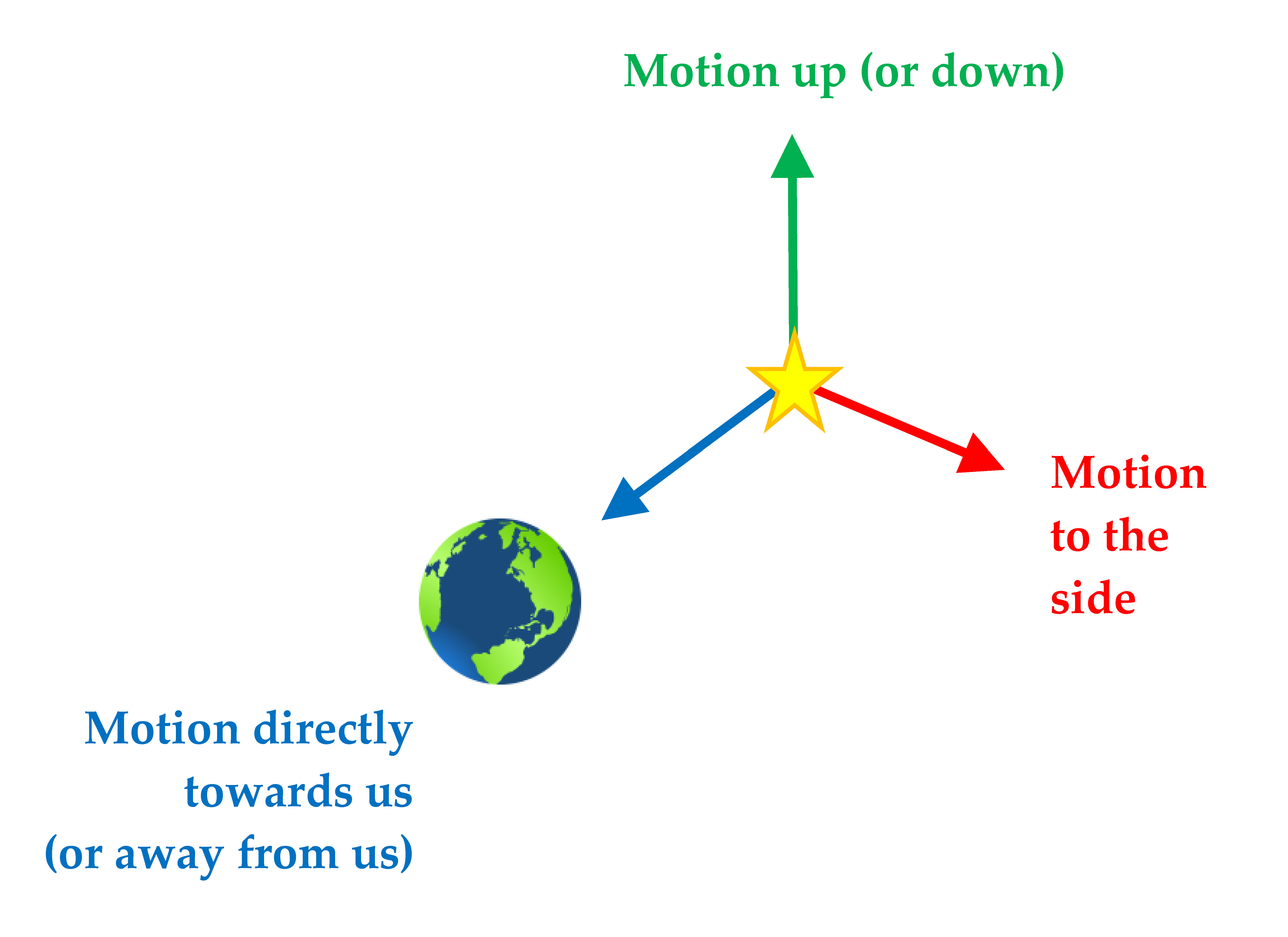 Any particular star probably won't be moving only directly-toward or directly-away from us (if it were, then from our perspective, it wouldn’t appear to move at all, just grow immeasurably brighter or fainter). Instead, the star will also be moving crosswise, and up or down. We can describe this kind of movement mathematically as a vector. By splitting the star’s motion vector into three mutually perpendicular components, we can define the true direction of that motion. The first component is directly toward us, and the second and third components are each in a direction that is perpendicular to the first one and to each other.