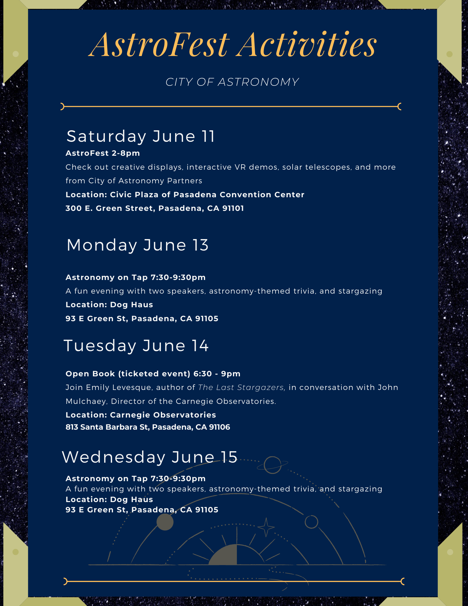 AstroFest is a free and family-friendly festival of astronomy-themed exhibits starting on Saturday June 11 from 2 - 8 pm. The Pasadena community event will include VR demos, gravity-well, self-guided Solar System tour, 3D models and much more ...