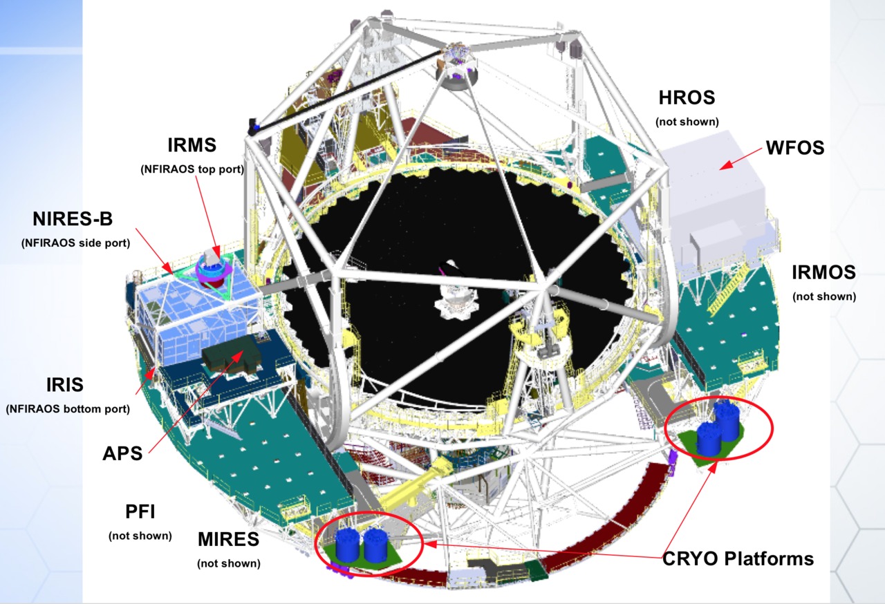 Dewars of liquid nitrogen (LN2) installed on the two Nasmyth platforms provide each TMT instrument’s cooling needs and maintain a steady state of cooling for all instruments. The total wet mass (including full cryogen load) of the CRYO components on each Nasmyth platform shall be less than 3,000 kg.