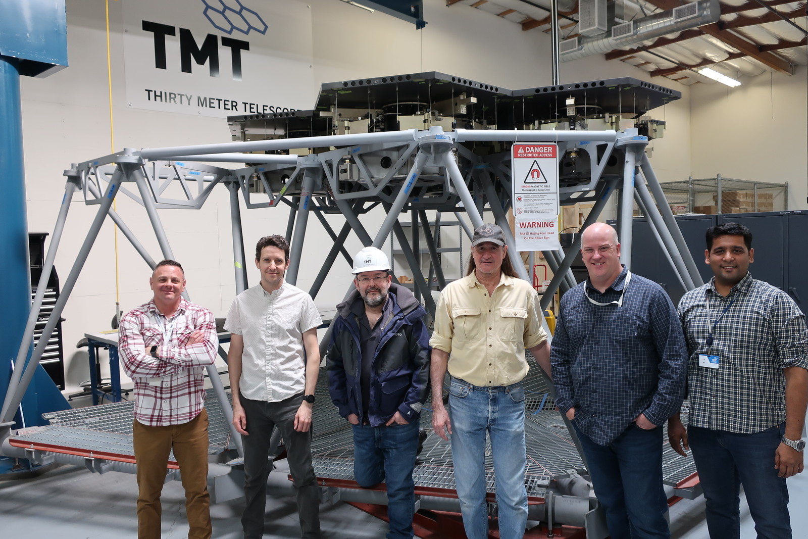 Left to right: Bryan Smith (Quality Assurance and Testing Engineer), Alastair Heptonstall (Senior Opto-mechanical Engineer), Chris Carter (Telescope Controls Engineer), Alan Tubb (Associate Opto-mechanical Engineer), Ben Gallagher (M1 System Lead Engineer) and Nikhil Naik (Production Support Manager).