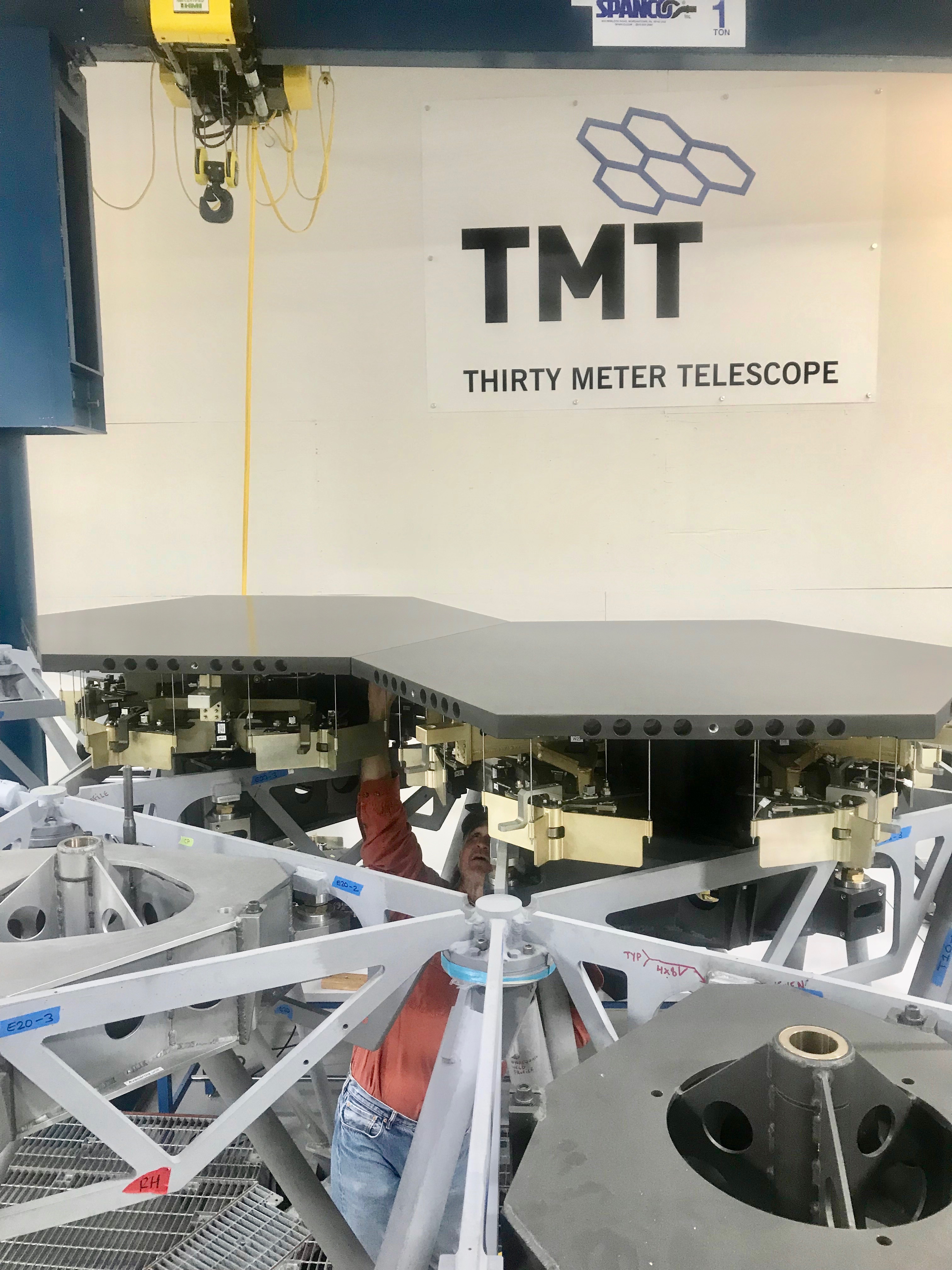Alan Tubb, TMT Opto-Mechanical Engineer, installing the TMT Primary Segment demonstration assemblies fitted with aluminum mirror segments in Monrovia Lab. -Image credit: TMT International Observatory