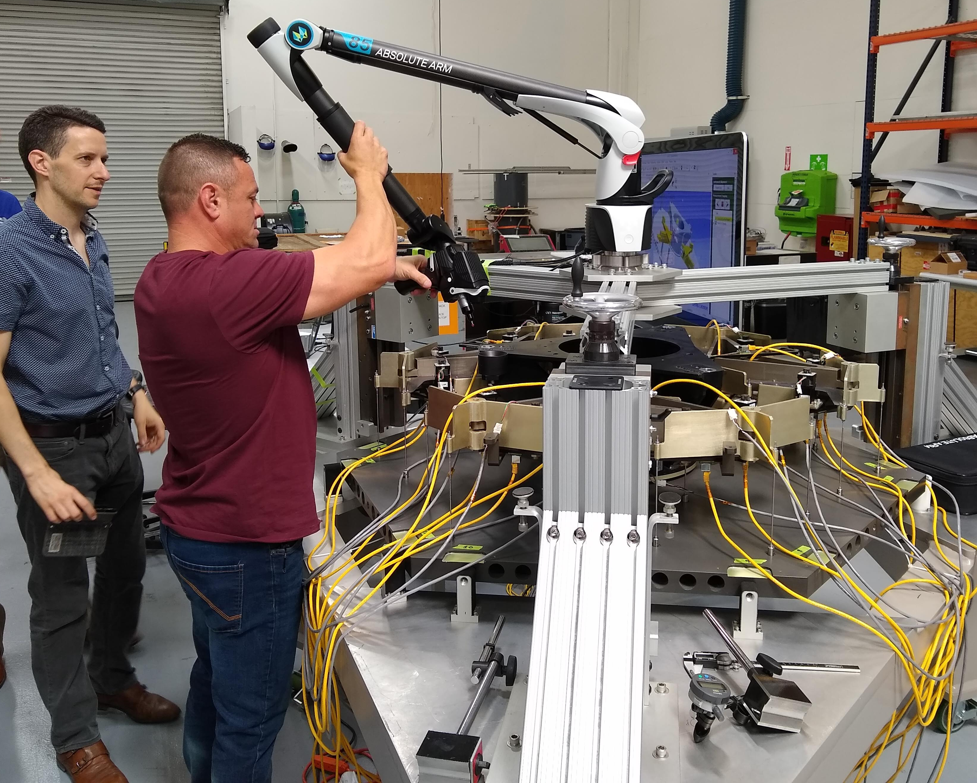 TMT M1 Segment Components and Assembly Inspection. TMT Senior Opto-Mechanical Engineer, Alastair Heptonstall, positioning the portable CMM, an advanced metrology system used to measure and check the feature locations of TMT M1 aluminum segments that will be integrated in the mirror cell platform at the Monrovia technical lab.
