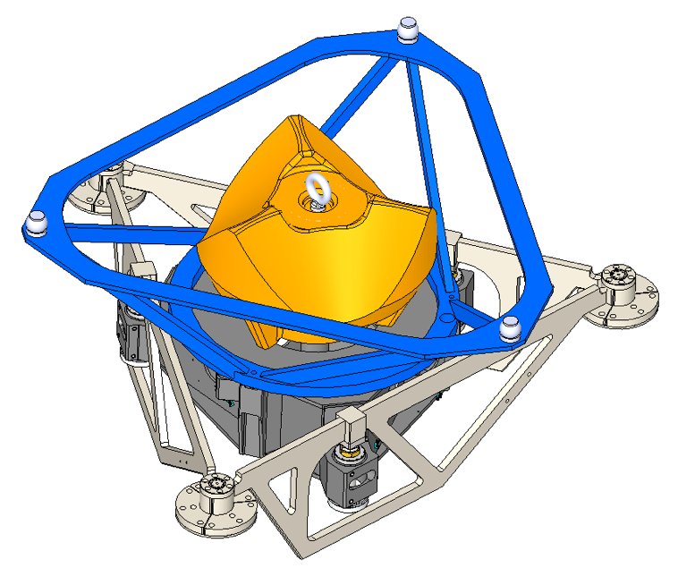 Graphic of one TMT Prototype Metrology Frame - The metrology frame highlighted in blue is located on one TMT fixed frame, designed with a dummy mass (color gold) placed in the mirror cell. - Image credit: TMT International Observatory