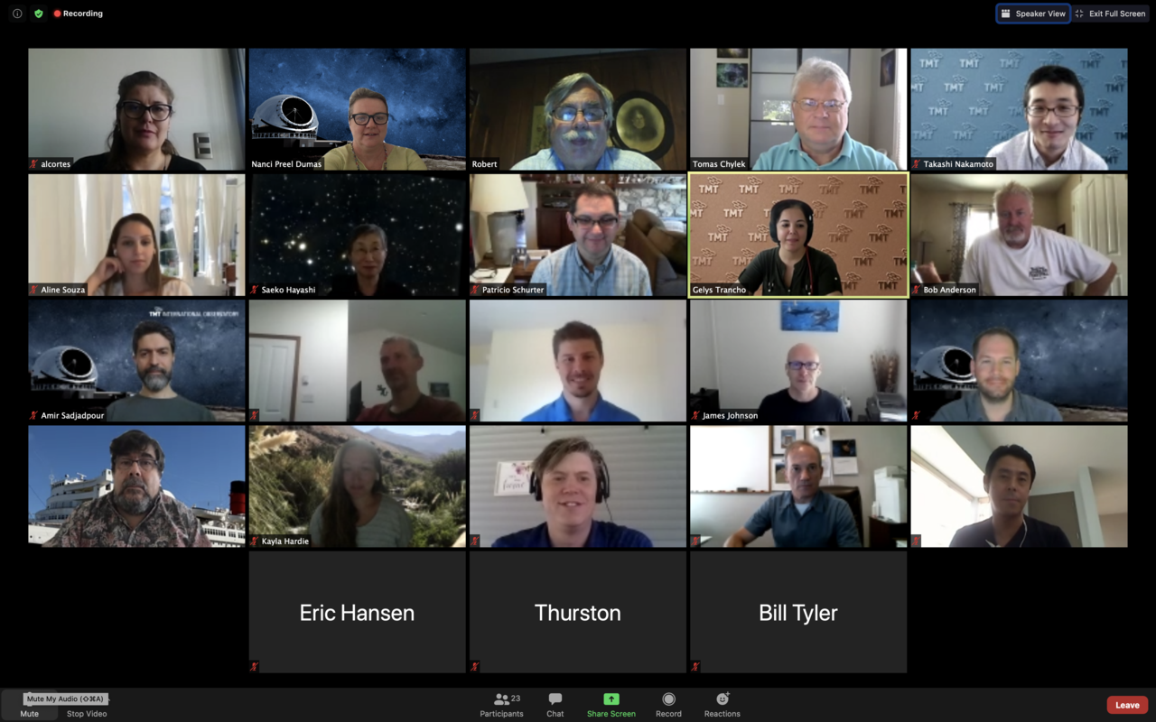 Screenshot of the participants of the TMT’s Primary Mirror Cleaning Preliminary Design Review on 19 August 2020. The review was led by TMT Engineers Tomas Chylek and Takashi Nakamoto from the project office. The review panel was composed of external experts from the European Southern Observatory, Gemini Observatory, Giant Magellan Telescope, and National Astronomical Observatory of Japan, in addition to TMT staff from the Safety, Structure, Controls and Software groups - Image credit: TMT International Observatory