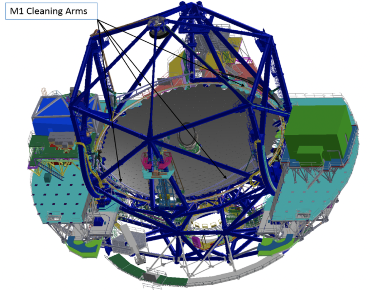 TMT’s Cleaning system for the Primary Mirror (M1) optics is automated and uses CO2 to clean the 492 mirror segments mounted in the M1 cell. Four robotic cleaning arms will sweep nozzles spraying CO2 evenly across the primary mirror. This cleaning process will be performed with the telescope locked in horizon-pointing orientation - Image credit: TMT International Observatory