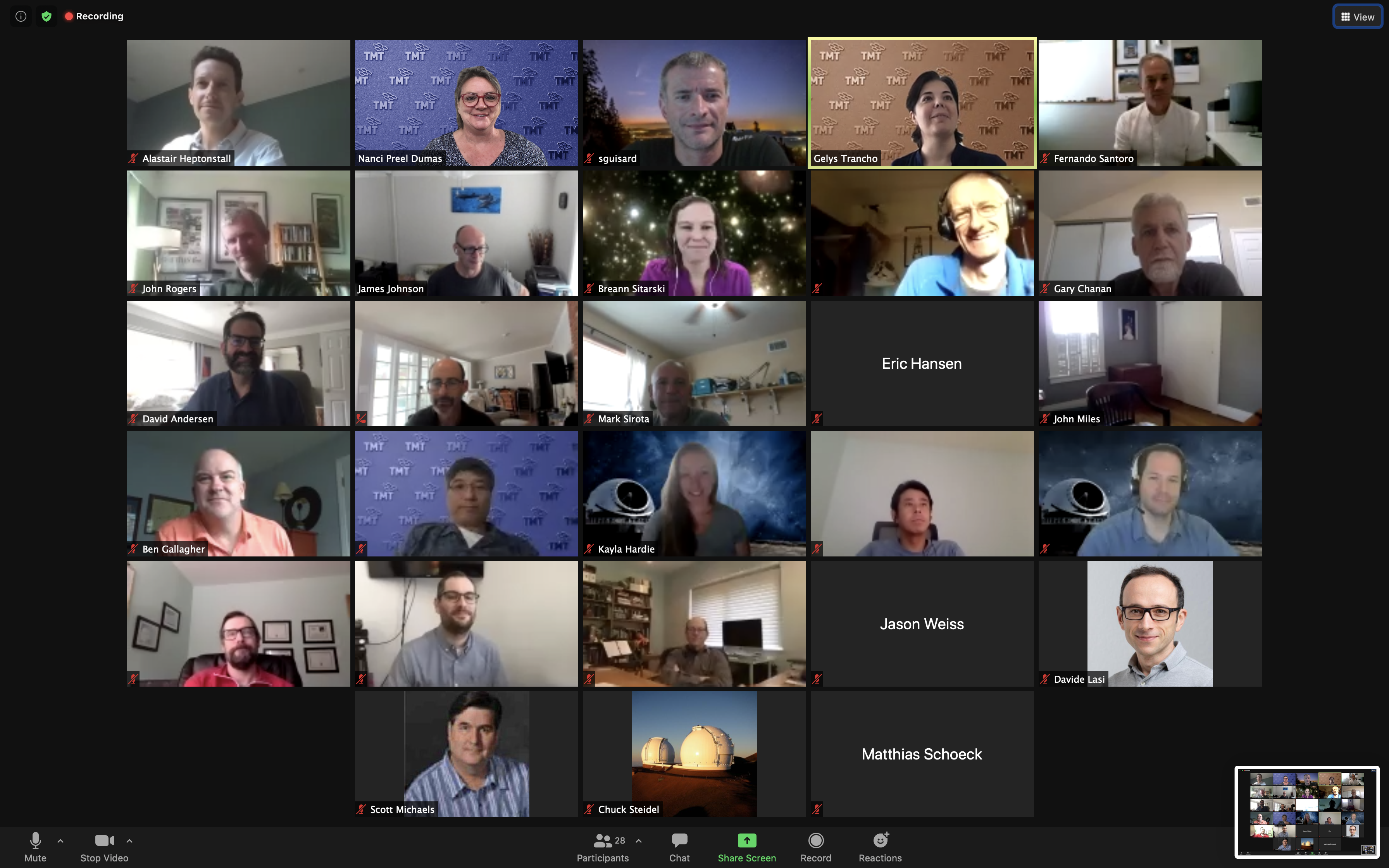 Screenshot of the TMT’s optical Test Instrument System (TINS) Preliminary Design Review participants on 16 September 2020. Nearly 30 engineers and scientists attended the review conducted remotely by video conference. The international review panel included experts from among DKIST, ESO, GMT and TIO astronomy communities - Image credit: TMT International Observatory