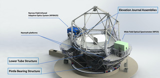 TMT Telescope Structure Subsystem - The telescope structure system provides structural support and precise motion, and also space for accessing and servicing the telescope optics, their associated systems (M1S, M2S, M3S), the science instruments, adaptive optics systems, and auxiliary systems. STR cradles the TMT’s 492 articulated mirror segments as they relay the light of astronomical bodies to the M2 and M3 mirrors and finally to the several science instruments located on both lateral Nasmyth platforms - Image credit: National Astronomical Observatory of Japan (NAOJ)