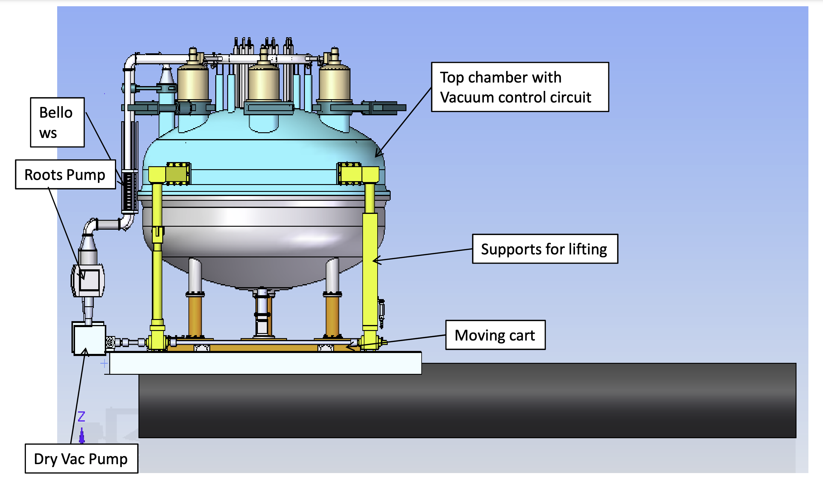 The custom designed coating chamber for TMT will allow precisely controlled depositions of thin and uniform layers of metallic and dielectric materials. It will be conceived to operate in a high vacuum to ensure a pure and durable coating. For that purpose, the coating unit is a large vacuum chamber with a diameter of ~ 4.5 meters. It is divided into two vessel sections and the mirror will be loaded into the lower half of the chamber and laterally secured onto a support system. For the loading and unloading of the mirror, the lower half of the chamber will be mounted on a rail driven by a high precision motor gear system and will be moved from the coating unit location to a mirror handling tool position.