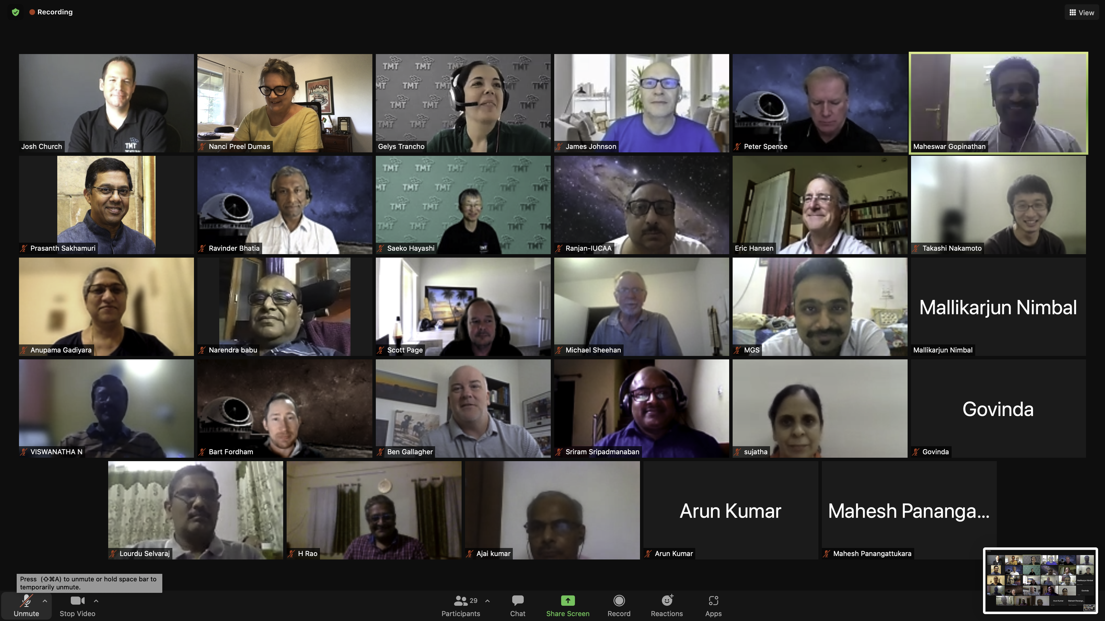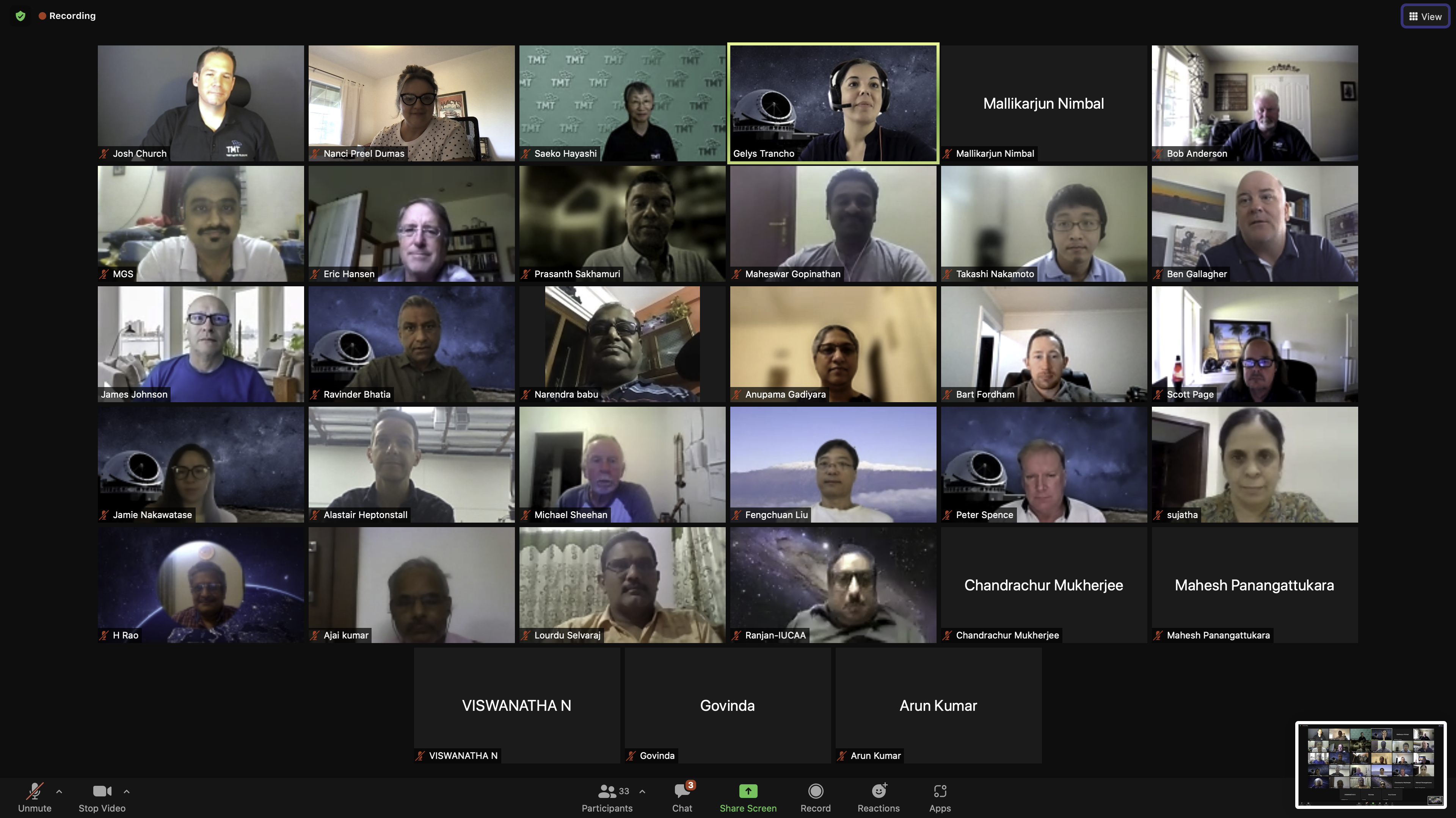 Screenshot participants of the Conceptual Design Review for TMT’s Secondary and Tertiary Mirror Coating Facility on August 4, 2021 - The review panel included professionals from TIO and the India TMT Coordination Center. Nearly 30 engineers and scientists attended the review conducted by video conference - Image credit: TMT International Observatory