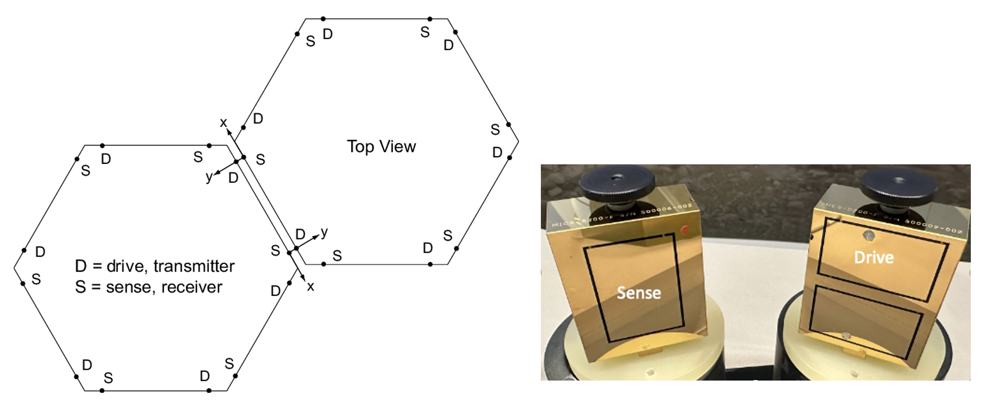 The drive side has two electrodes, each driven with AC voltages in the 50–100 kHz range. These two sensors couple capacitively across an ~5mm gap to a single electrode on the sense side. The gap between mirror segments is 2.5 mm. Demodulating the AC signals in firmware produces two 32-bit integer data products: