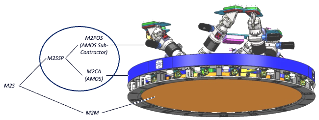 TMT M2SSP preliminary design. The secondary mirror (M2M) will be mounted in a steel mirror cell (M2CA) that contains the axial and lateral supports for the mirror. An internal interface (AMOS scope) exists between the M2CA and the hexapod M2 positioner (M2POS). The M2POS interfaces with the Telescope Structure. Image credit: AMOS