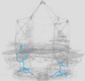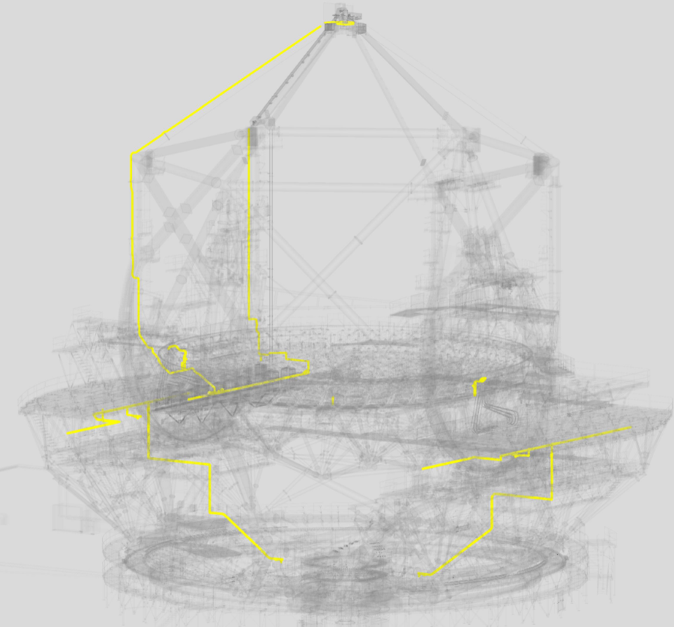 | The blue lines indicate the flow of the VTCW piping on the telescope structure. There's a lot there that needs cooling! | The yellow lines indicate the flow of the FCA piping. It's even more extensive than the VTCW piping! |