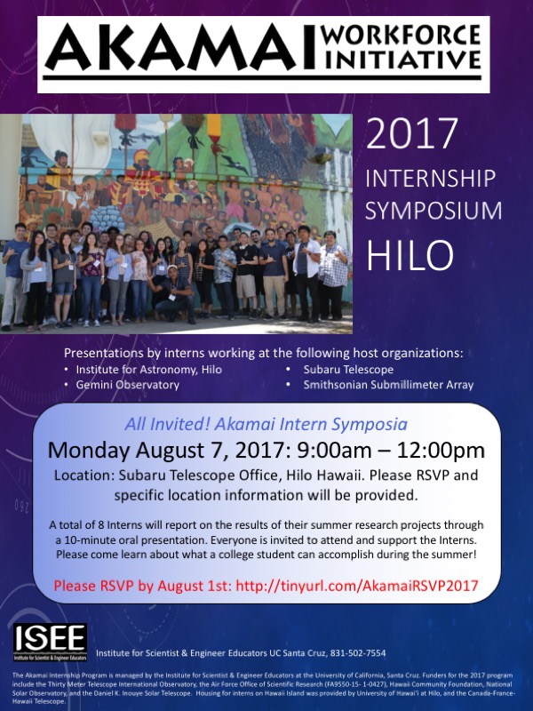 The Akamai Workforce Initiative’s Internship Program will hold its Student Internship Symposiums on Hawaii Island in Hilo and Waimea on Monday, August 7. Hawaii college interns will present their summer projects with a follow-up question and answer period.