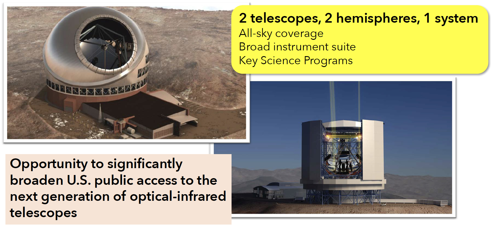The National Science Foundation’s National Optical-Infrared Astronomy Research Laboratory (NOIRLab), the Giant Magellan Telescope Organization, and the Thirty Meter Telescope International Observatory (TIO) are working collaboratively to develop a U.S. Extremely Large Telescope Program (US-ELTP). The vision of the US-ELTP is to allow scientists to look more deeply and more precisely into the night sky than ever before. The dual hemisphere model will provide access to 100 percent of the night sky to make the next generation of discoveries about our universe.