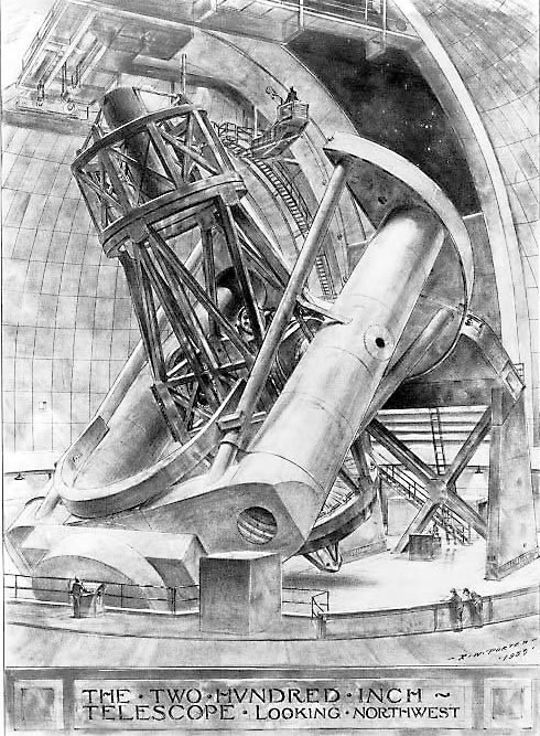 A mechanical rendering of the Palomar 200" telescope from Russel Porter. Courtesy of Caltech Archives and Special Collections.