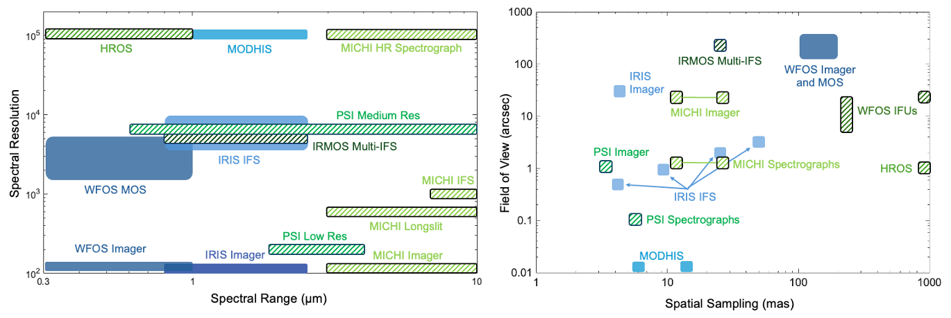 TMT science instrumentation capabilities. TMT covers a large fraction of the discovery space with its first light (solid) and first generation (hatched) instruments.