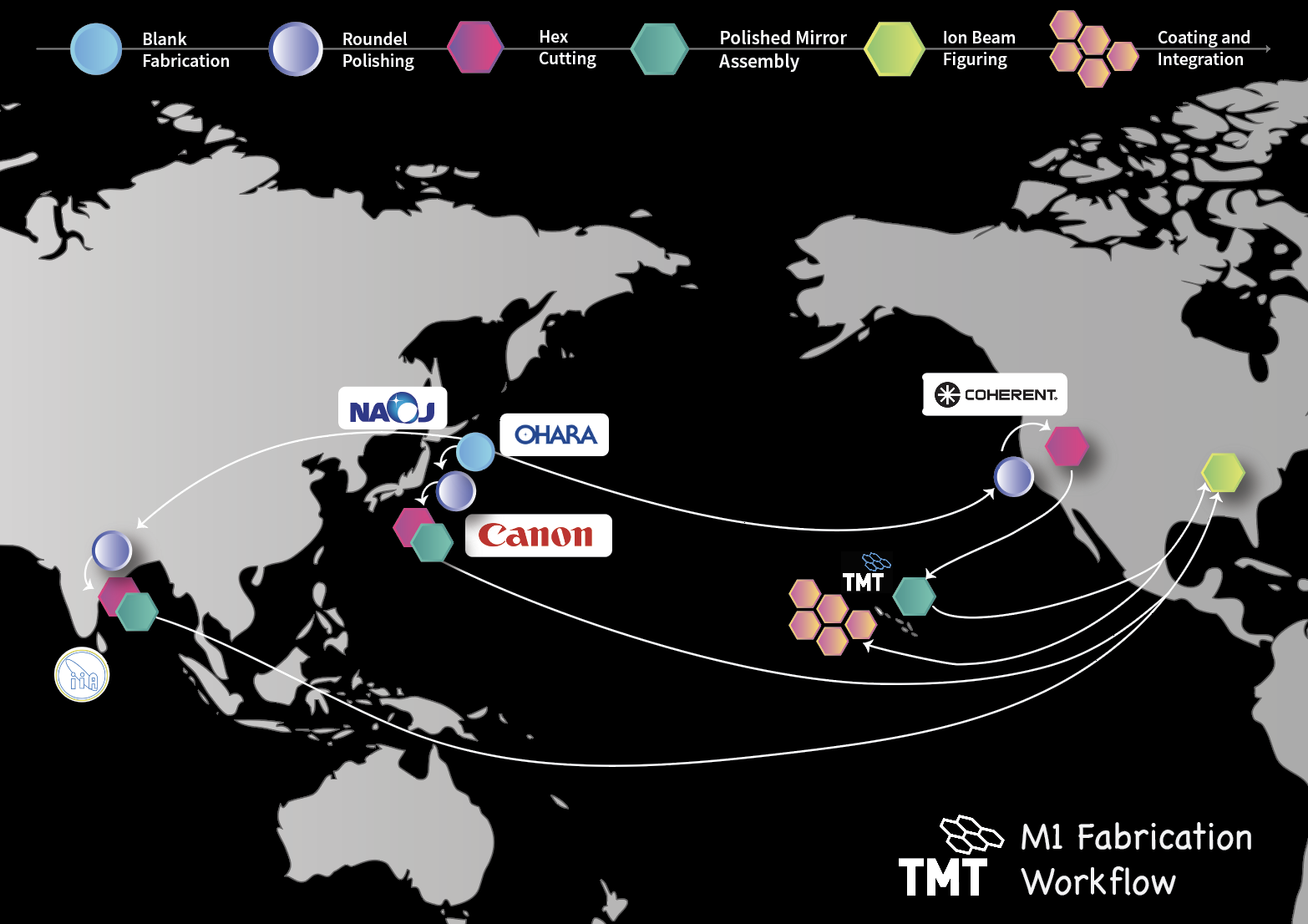 As you can imagine, producing 574 precision mirrors to the standards of TMT takes some time, so we are producing them now. Forming one of these 574 mirror segments takes several steps. First of all, they are cast as round pieces of glass we call blanks. These are all produced in Japan. These blanks then get distributed to three teams (55% go to the U.S., 30% go to Japan, and 15% go to India) where they are polished into what we call roundels, cut into hexagonal segments, and integrated in their support structure, the polished mirror assembly, which we abbreviate as the PMAs. Dividing this work up among these three teams not only is more efficient, but it is a risk mitigator as well: if one team has a delay, the other two can take on more.
