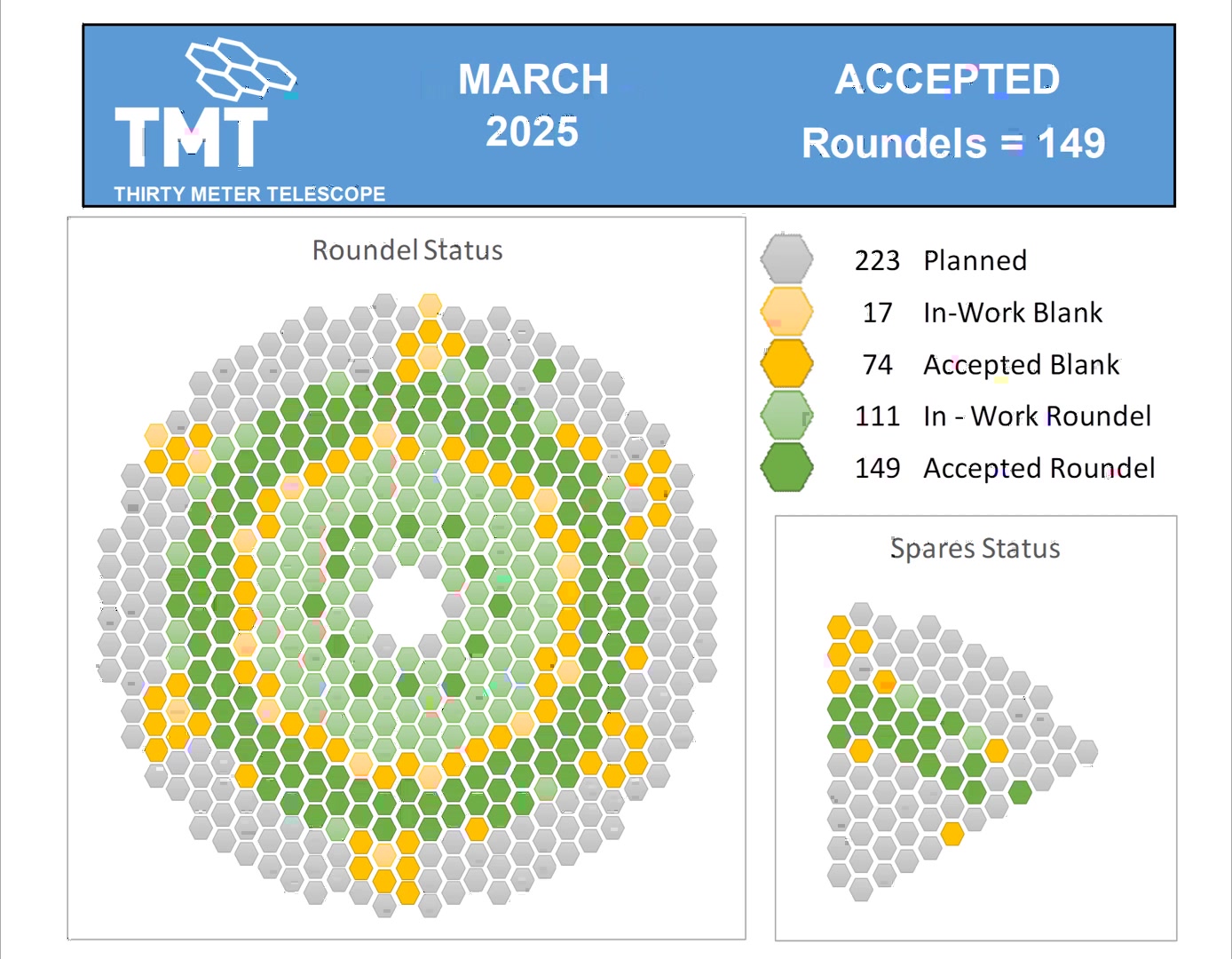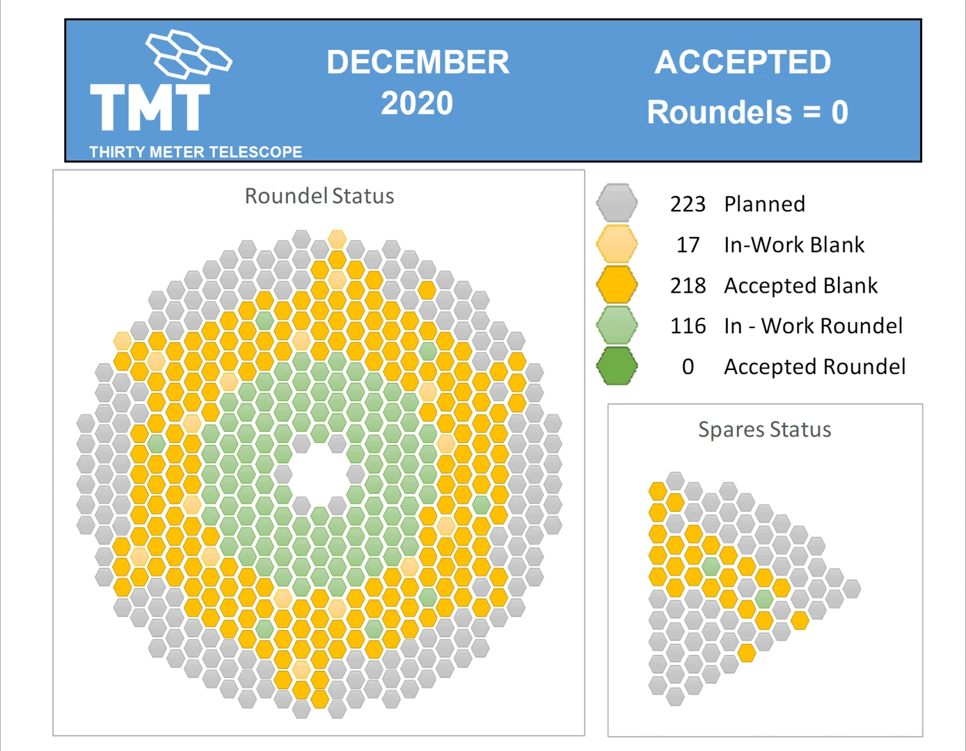 You can watch the video below which shows each segment of the mirror, whether in the primary mirror, or the spare sector, color coded to match where it is. Here you can see the outer ring of blanks not yet made, and the inner ring of blanks changing from in-work blanks to accepted blanks to in-work roundels to accepted roundels. The numbers in the table are also updated with each image, resulting in the figure you see above.