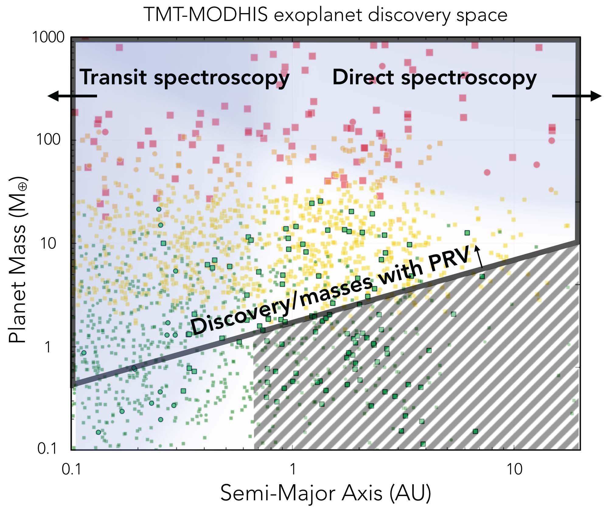 Potential exoplanet discovery and characterization space for TMT-MODHIS, simulated planet populations within 27 pc (Kopparapu et al. 2018). Diagonal line is for 20 cm/s RV precision. Red markers; giant planets > 6 RE (Earth radius), orange; Neptunes (6 > RE > 3.5), yellow; mini-Neptunes (3.5 > RE > 1.75), dark green; hot super-Earth and Earth-size planets (1.75 > RE > 0.5), and light green; temperate super-Earth and Earth-size planets.