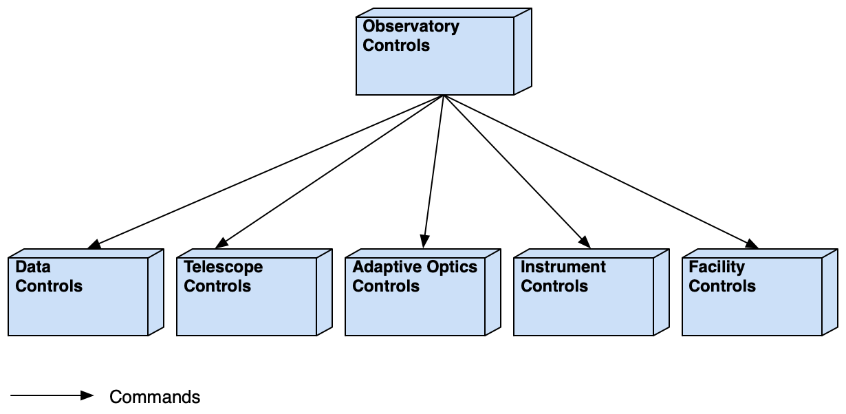 The architecture partitions the software into six logical groups of related functionality called Principal Systems to aid reasoning about the software system as shown below. Each principal system is focused on specific, easily-identifiable functionality and is itself a collection of other software components or systems. Viewing the system at this level allows one to think more easily about flow of control and where software functionality exists in the system. This view shows communication is hierarchical and flows down from Observatory Controls to the other principal systems. This command communication is low-bandwidth by design; any high-speed communication occurs within a single principal system. For instance, the high-speed adaptive optics loops occur only within the AO Controls Principal System.