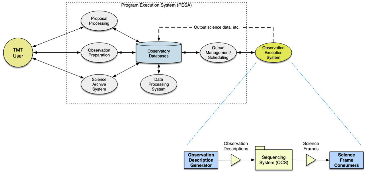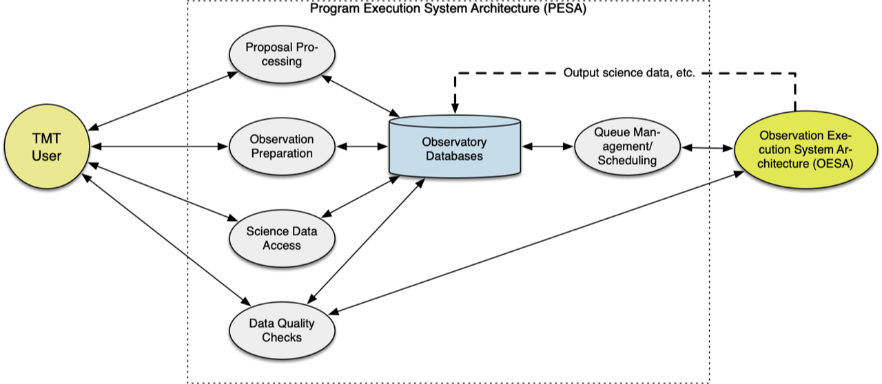 The TMT Software System Architecture is split into two parts called the Program Execution System Architecture (PESA) and Observation Execution System Architecture (OESA). The primary function of the PESA is to enable efficient management of astronomical programs from proposal creation to data delivery. The OESA facilitates effective observation of astronomical objects, as well as proficient command, control, and monitoring of all observatory functions. The job of the PESA can be summarized as getting observation descriptions to the OESA and delivering generated science data to external data centers. The basic components of PESA and OESA and their relationships are shown in the following figure.