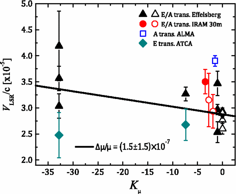 Measuring alpha. Wavelength residuals seen in QSO spectra vs. sensitivity coefficient. The slope indicates a variation of the ratio of the masses of the proton and electron (Bagdonaite et al. 2013a,b, 2014)