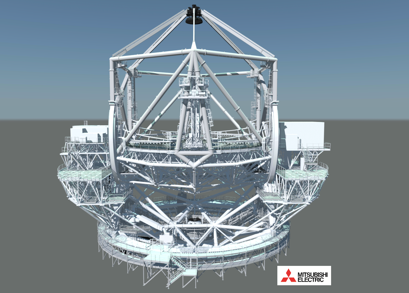 Rendering of the front view of the telescope structure showing the NFIRAOS instrument on the left and the WFOS instrument on the right. For perspective, the telescope is ~55 meters or 180 feet wide and ~50 meters or 160 feet tall. The segment handling platform is to the rear and the mirror cleaning arms can be seen at the front and rear edges of the primary mirror. Image credit to Mitsubishi Electric Corporation and National Astronomical Observatory of Japan