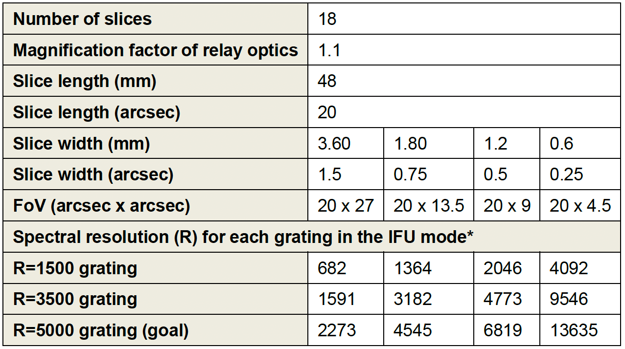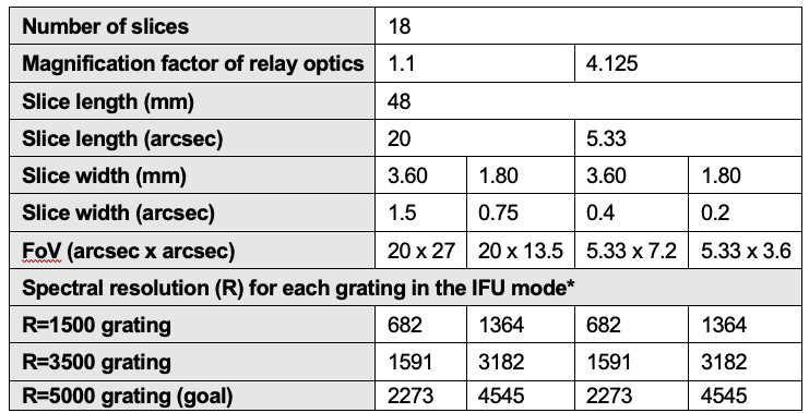 The table below shows current parameters of the IFU. In the current concept, the IFU has two relay optics with different magnification factors and two slicers with different slice widths, and these slicers and relay optics are separately switchable. Their combination provides four different field-of-view (FOV) options with different slice widths on sky.