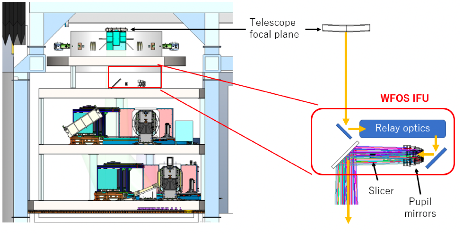 WFOS has been designed to allow a future addition of an Integral Field Unit as an upgrade path for the instrument. When using the IFU observing mode, the IFU would be installed behind the telescope focal surface and above the collimator system and the camera system as shown below. In the other observing modes (slit spectroscopy and direct imaging), it is retracted from the light path.
