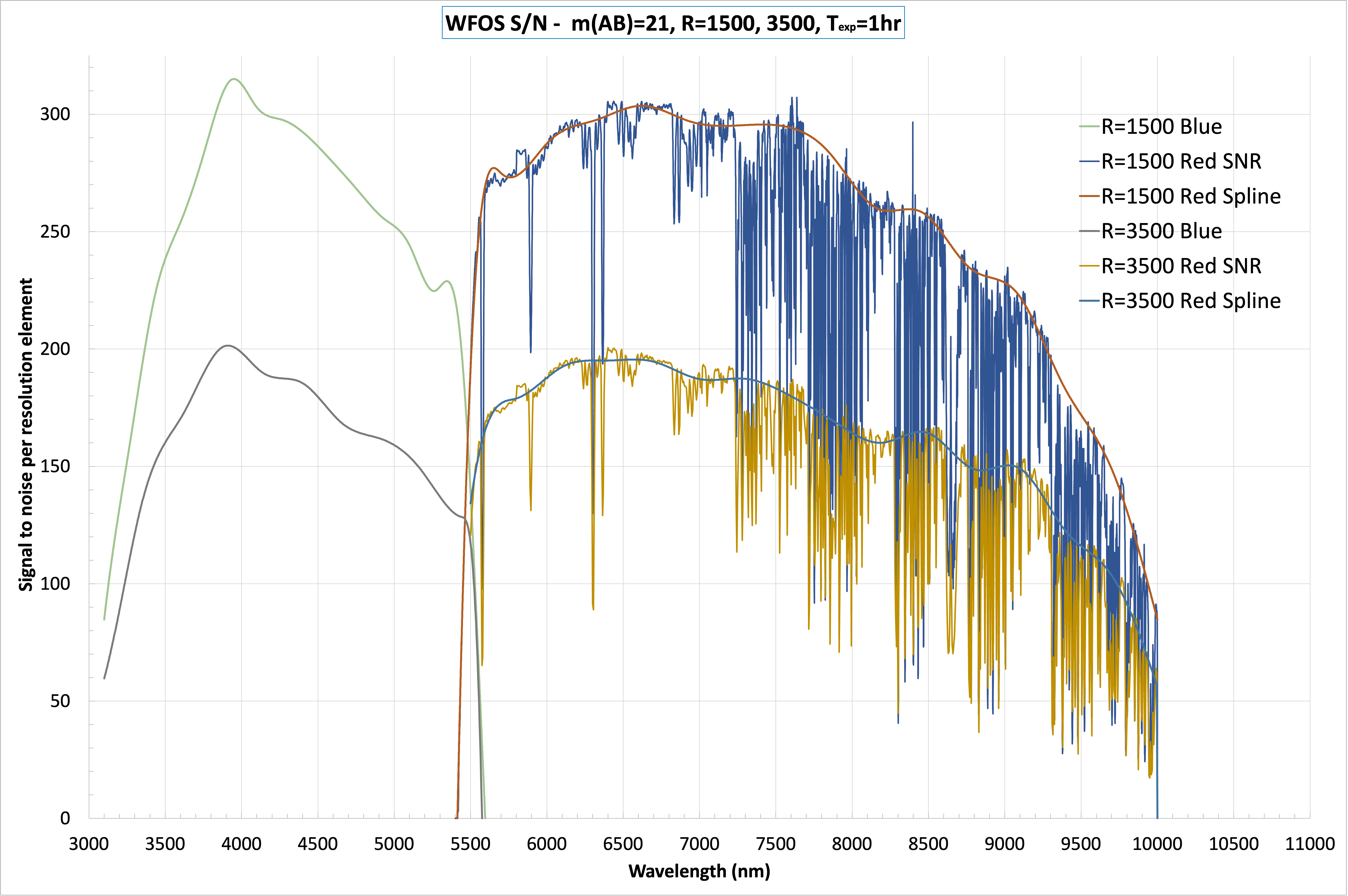 3) The reflectivity of the telescope optics assumes a UV enhanced coating and makes reasonable assumptions about performance shortward of 3400 A. The currently baselined Gemini-type coating would significantly degrade the performance below 4000 A compared to the assumed coating, and would be close to zero by 3400 A. However, telescope optics coatings with enhanced UV performance are being explored, it is quite probable that an enhanced coating could be available for the time of TMT First Light and WFOS is designed to operate up to the UV atmospheric cutoff at ~3100 A.