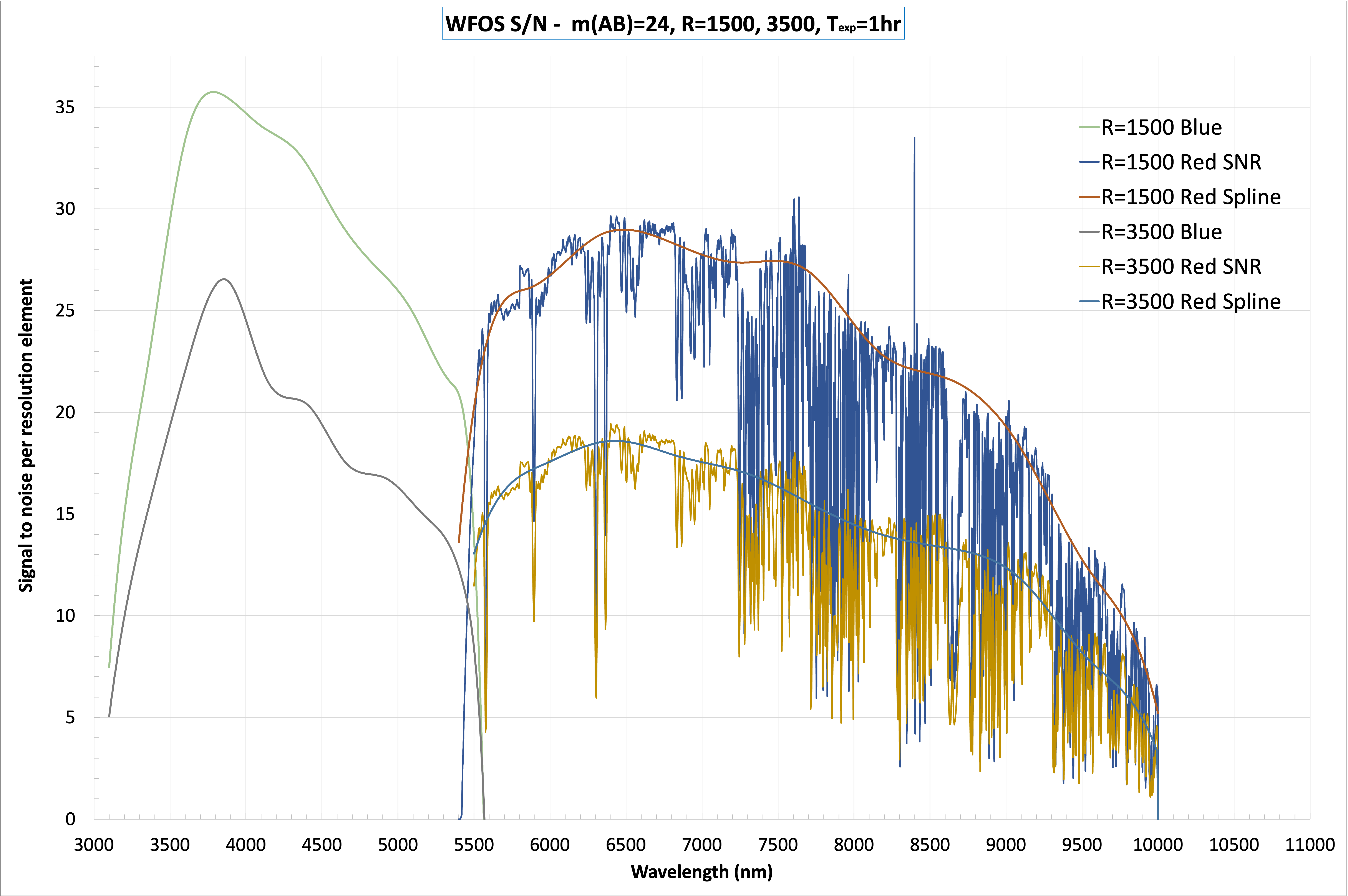 Below are curves showing SNR vs. wavelength for WFOS configurations, R=1500 and R=3500, for m(AB)=16, m(AB)=21, and m(AB)=24 for 3600 second integrations. To scale the tabulated SNR to other apparent mag levels and integration times: